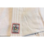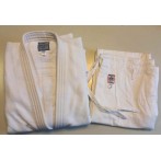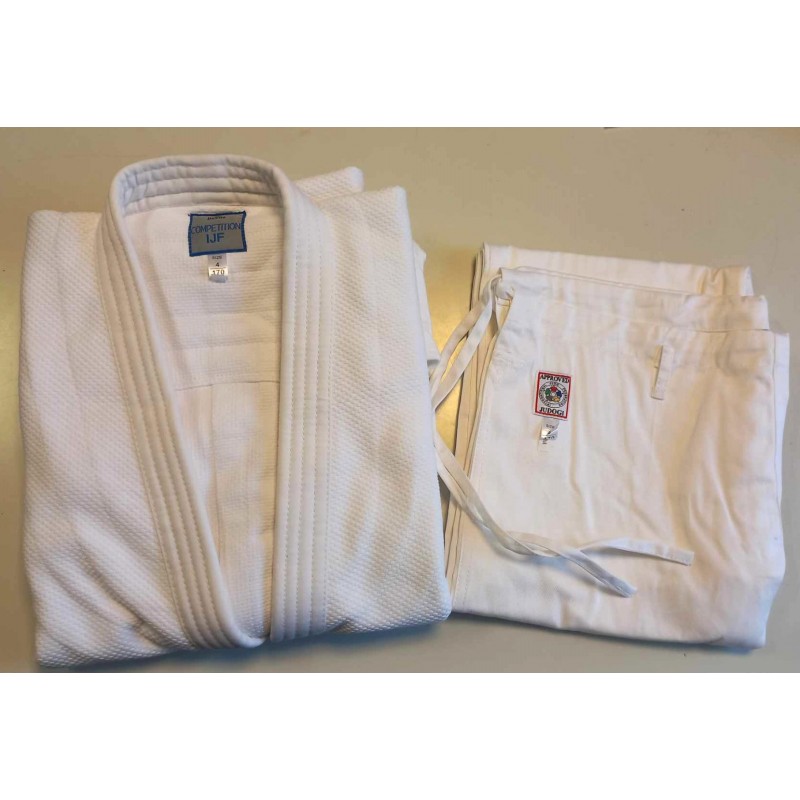 Для состязаний. Кимоно выполнено из белого хлопка и включает куртку и штаны.